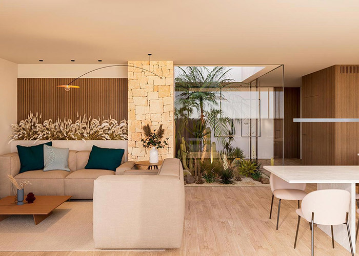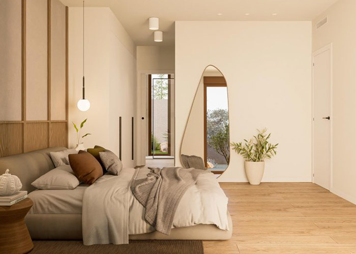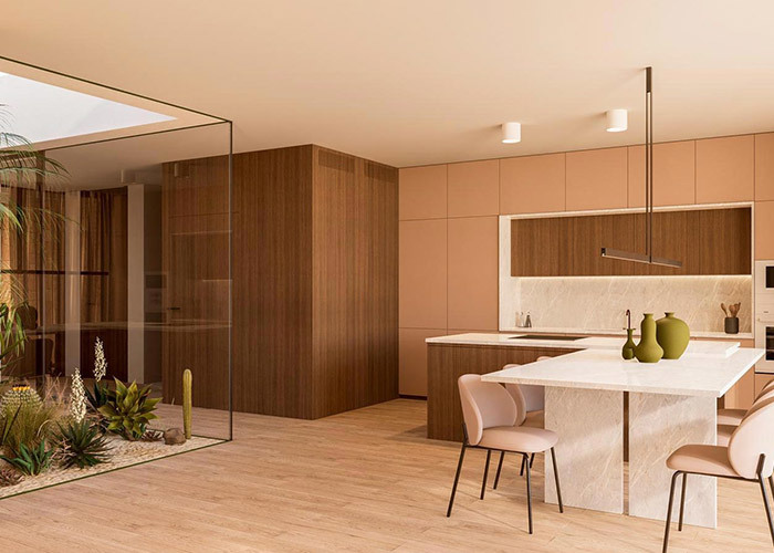 左側には 広々としたリビング エリアがあります併設浴室のある寝室は,一階建ての生活を好むゲストや家族に適した便利な宿泊施設を提供します.右側には,キッチンとダイニングゾーンが日常使用のための統合されたスペースとして配置されています.