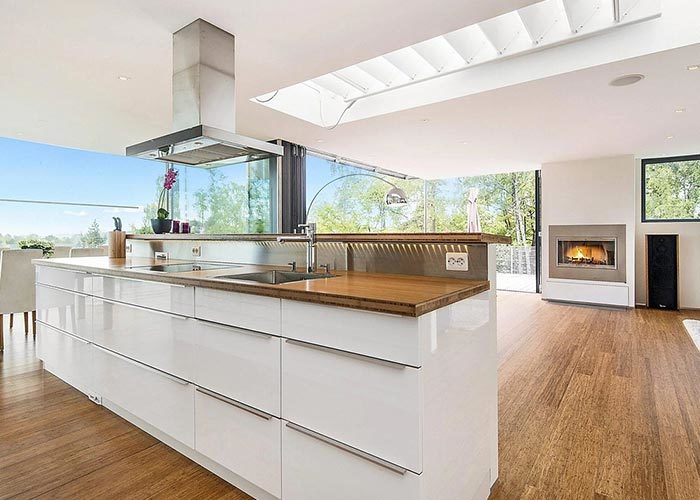 「L」の短い方の辺は、家のパブリックエリアに充てられています。ここでは、デザインは開放性と自然光を優先しています。